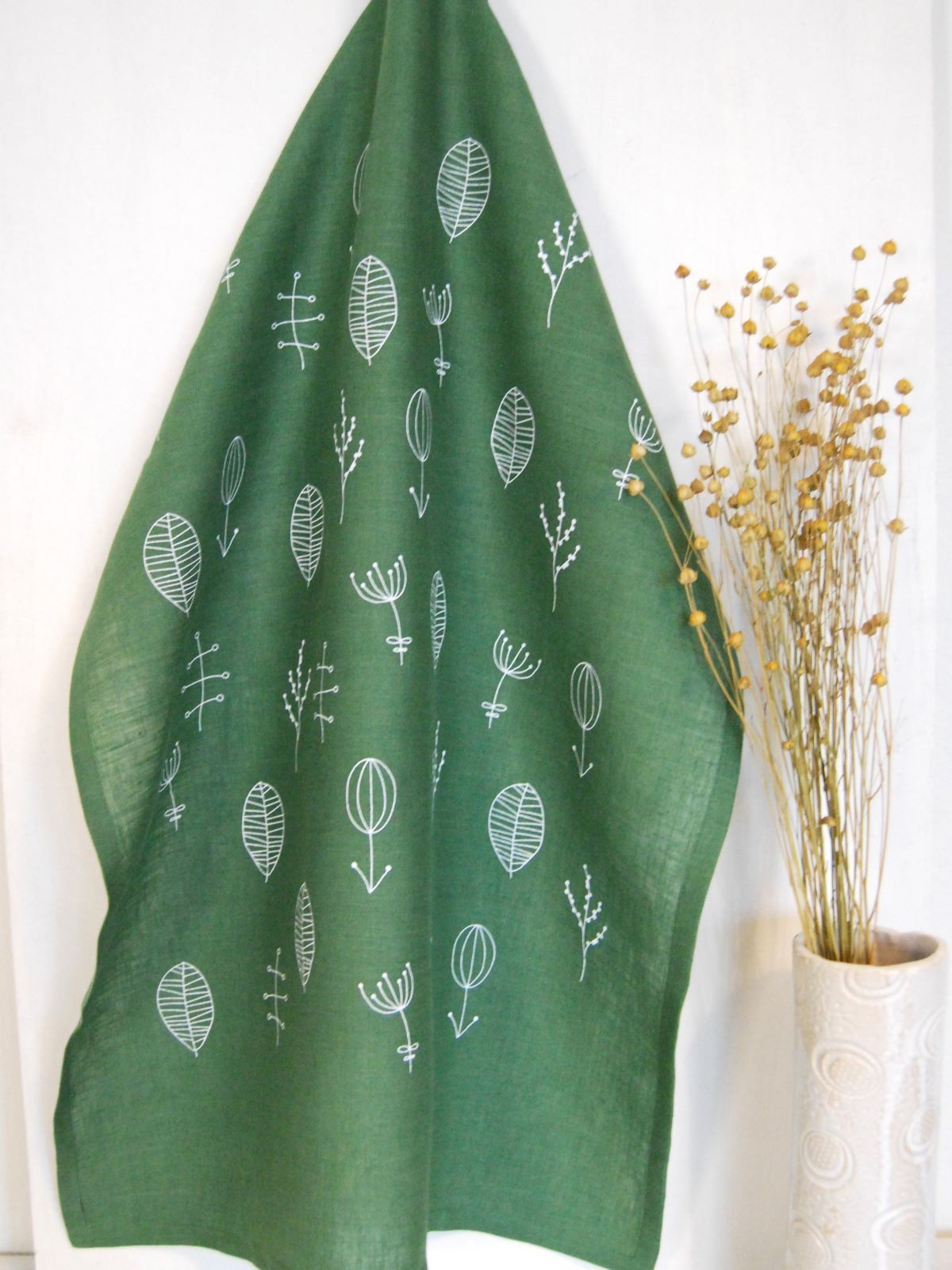 Käsin painettu kaunis keittiöpyyhe 100 % pehmennettyä pellavaa. Flora-kuosin graafiset kasvit edustavat yksinkertaista ja ajantonta estetiikkaa. Tämä pyyhe sopii monenlaiseen tyyliin ja tuo arkeen ripauksen villiä luontoa ja hyvää mieltä.