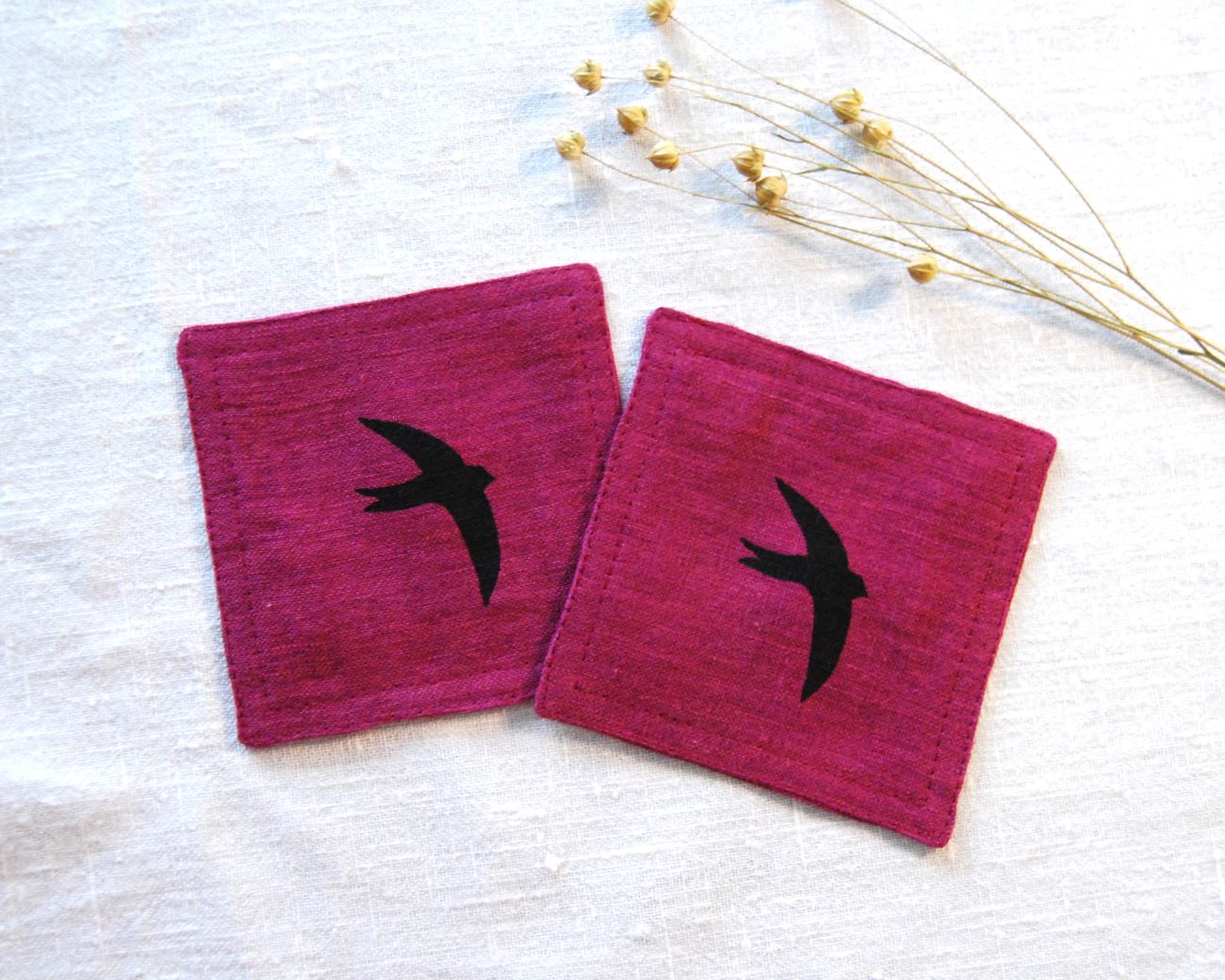 Käsin painetut ja ommellut lasinaluset kaksinkertaista pellavaa. Saatavilla eri väreissä, joten voit valita juuri omaan kattaukseesi sopivat sävyt.