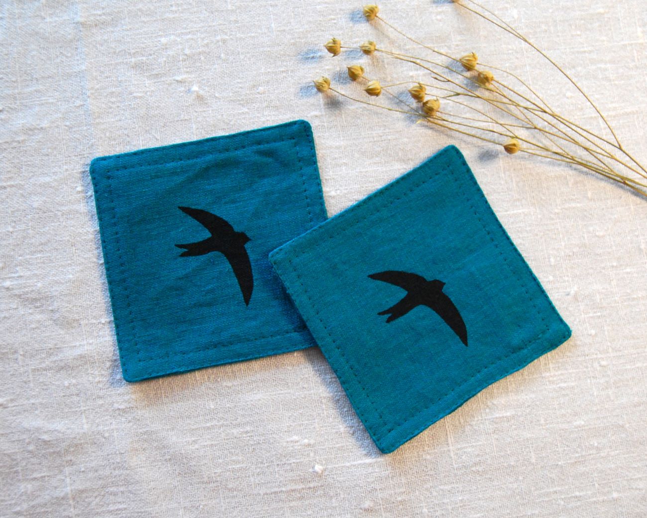 Käsin painetut ja ommellut lasinaluset kaksinkertaista pellavaa. Saatavilla eri väreissä, joten voit valita juuri omaan kattaukseesi sopivat sävyt.